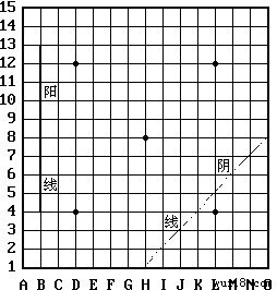 棋盘上无实线连接的A1~O15和A15~O1两条隐形斜线,以及与此二条斜线平行的由交叉点连接形成的其它隐形斜线,见图2。