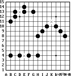 三三禁手:黑棋一子落下同时形成两个或两个以上的活三,此子必须为两个活三共同的构成子,见图8,图中X点为禁手点。